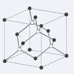 La estructura de Sulfuro de Zinc tiene la misma celda primitiva que la del Diamante, es decir, dos fccs donde la segunda fcc está desplazada ¼ de la diagonal del cubo. La diferencia estriba en el motivo, ya que si en la estructura diamantina todos eran iguales, en el Sulfuro de Zinc el primer fcc contiene únicamente átomos de Zn y el segundo fcc contiene sólo átomos de S. Hay cuatro moléculas de ZnS por cada celda primitiva. Cada átomo tiene cuatro átomos vecinos de la clase opuesta dispuestos en las esquinas de un tetraedro regular, tal como se puede ver en la figura 9. Ejemplos de estructuras cúbicas de Sulfuro de cinc son: