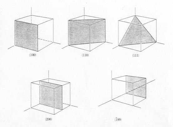 Los planos cristalográficos se denotan por los índices de Miller. Estos índices corresponden a los inversos de los puntos de corte del plano que queremos caracterizar con cada uno de los ejes de coordenadas, y se representan entre paréntesis sin comas (hkl). Los índices de Miller pueden representar a un plano o a toda una familia de planos paralelos que tienen la misma orientación. Para calcular los índices de Miller hemos de hacerlo siempre sobre un plano de la familia que no pase por el origen.