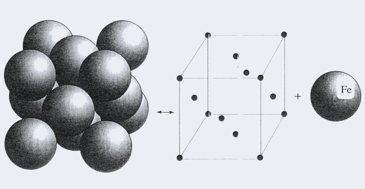 Figura 1: En este caso la red se conoce como Cúbica centrada en las caras (fcc), y el motivo es el átomo de hierro (Fe).