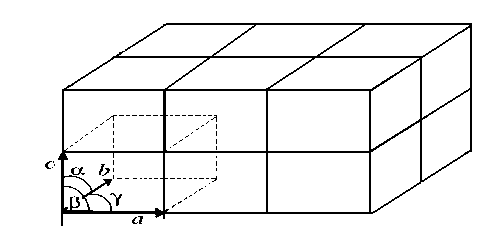 Una celda unitaria se caracteriza por tres vectores que definen las tres direcciones independientes del paralelepípedo. Esto se traduce en seis parámetros de red, que son los módulos, a, b y c, de los tres vectores, y los ángulos ab y l que forman entre sí, como se muestra en la figura 2. Estos tres vectores forman una base del espacio tridimensional, de tal manera que las coordenadas de cada uno de los puntos de la red se pueden obtener a partir de ellos por combinación lineal con los coeficientes enteros.
